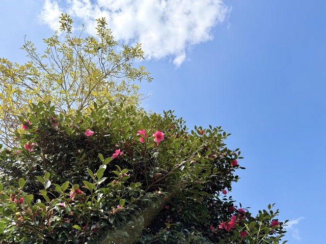 玄関前の椿がまた素敵で、まわりの緑の中に紅一点。